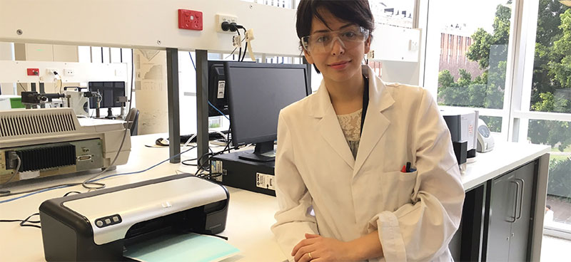 PhD candidate Parisa Khiabani holding the low-cost paper based sensor developed by Scientia Professor Justin Gooding and his team at The University of New south Wales. Image courtesy of Mehran Bolourian Kashi