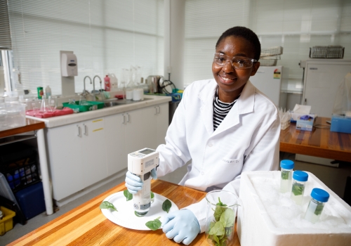 Date: 1 July 2019 Ms Vongai Dakwa, a PhD candidate at the ARC Training Centre for Innovative Horticultural Products at the University of Tasmania, is working on increasing the shelf life of baby spinach and other baby salad leaves, so it keeps fresh in your fridge for longer. Ms Dakwa is working with Woolworths and Houston’s Farm, a Tasmanian grower and processor of baby leafy salad vegetables, to conduct a range of laboratory experiments, to examine a range of post-harvest factors that increase shelf life. Baby leafy salad vegetables currently have a short shelf life of only about 12 days. The research team has been investigating the influence of storage temperature, surface moisture and bruising on shelf life. Laboratory trials found that damaged leaves greatly decreased the shelf life of baby leafy vegetables like rocket and spinach. The research has revealed that shelf life can be increased if cotyledons—the first leaves to appear from a germinating seed—are not included with the packed baby spinach. Ms Dakwa and the team have also shown that high levels of moisture in packed leafy salad vegetables reduce the product shelf life. They are now trialling innovative ways to remove excess moisture in the bags so the baby salad leaves stay fresher for longer. Ms Dakwa’s research project is one of ten PhD projects being conducted at the ARC Training Centre, led by food safety expert, Associate Professor Tom Ross, from the Tasmanian Institute of Agriculture. Image: PhD Candidate Vongai Dakwa measures the colour of baby spinach using a colourimeter in a Tasmanian Institute of Agriculture lab. Credit: Supplied by the Tasmanian Institute of Agriculture.