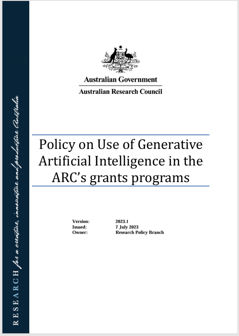 This policy was published on 7 July 2023. The purpose of the policy: To provide guidance for applicants, administering organisations and assessors. An updated version was published in 2026. Refer to the Policy on Use of Generative Artificial Intelligence in the ARC's grants programs – 2026 here. Download PDF (208.74 KB) Download DOCX (92.74 KB) Created date: 7 July 2023 Modified date: 7 July 2023 Publication date: 7 July 2023 Version: 2023.1