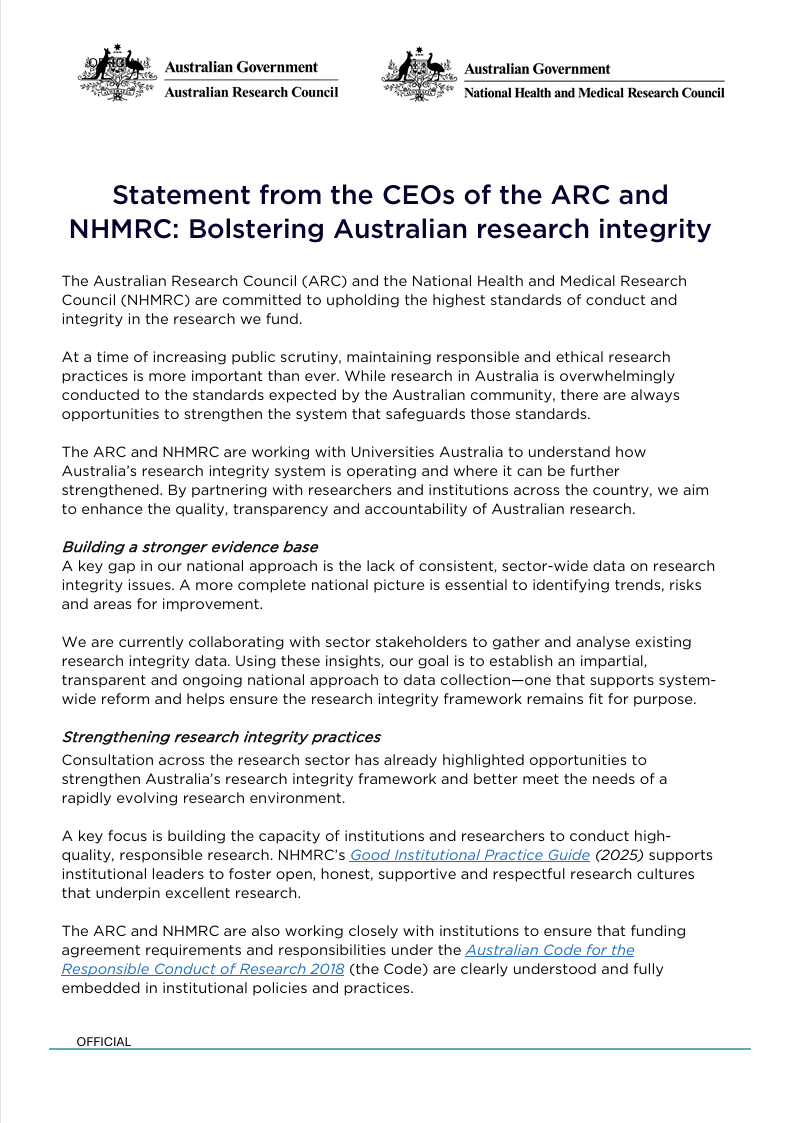 Research Integrity Joint CEO Statement released with the National Health and Medical Research Council (NHMRC). The Australian Research Council (ARC) and the National Health and Medical Research Council (NHMRC) CEOs have released a joint statement reaffirming their commitment to upholding the highest standards of research integrity in Australia. This statement was published on the 23 February 2026. Download PDF (155.58 KB) Created date: 23 February 2026 Modified date: 23 February 2026 Publication date: 23 February 2026